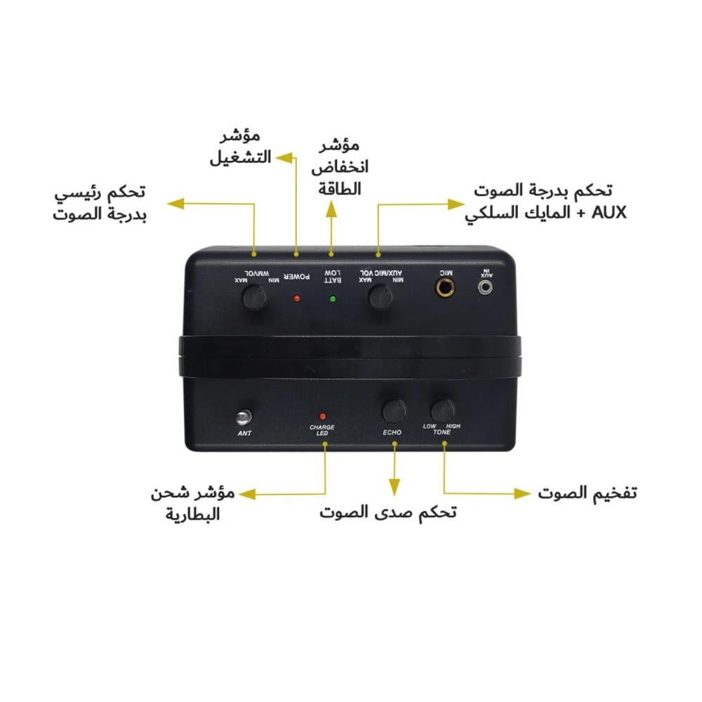 يأتي الجهاز مزودًا بمايكين لاسلكيين (يدوي + علاقي/رأسي) ليمنحك حرية كاملة في التنقل أثناء الإلقاء أو العرض، مع دعم تقنيات الاتصال الحديثة مثل البلوتوث، USB، كرت SD، ومدخل AUX، بالإضافة إلى راديو FM مدمج للاستماع إلى محطاتك المفضلة بجودة صوت عالية.